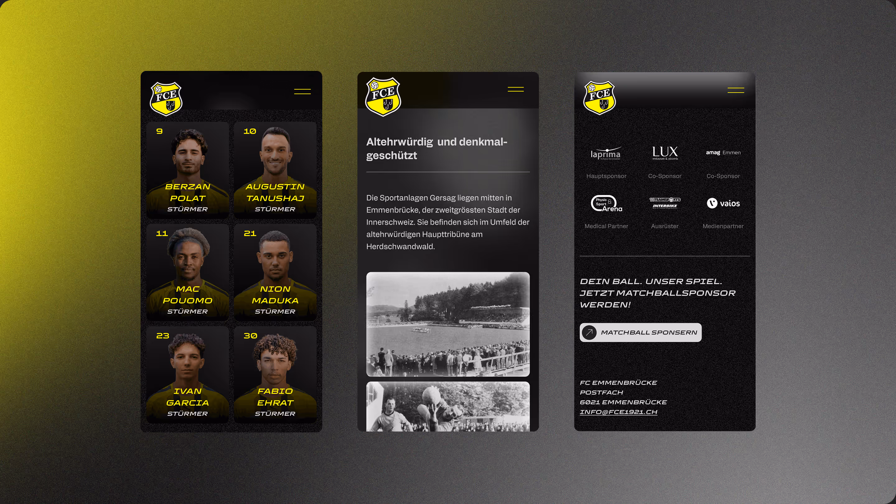 Als neuer Medienpartner haben wir die Website von Grund auf neu gedacht. Sportlich im Look, klar in der Struktur. Eine gestraffte Sitemap, automatisierte Formulare und ein übersichtlicher Spielplan reduzieren den Administrationsaufwand massiv. News, Eventkalender, Mannschaftsübersichten und ein Lageplan im CI/CD machen Orientierung einfach und halten Fans wie Mitglieder auf dem Laufenden. Ein schneller, pflegeleichter Auftritt, der den FC Emmenbrücke digital fit macht.